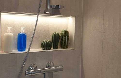 The kitchen is equipped with a stovetop, a refrigerator, and a dishwasher, as well as a coffee maker, an electric kettle, and a lobster pot. Bathroom amenities include a hair dryer, towels, and toilet paper. And because there's a washing machine, you can go a bit lighter on your packing. Other amenities include bed sheets, an ironing board, heating, and a dining table.