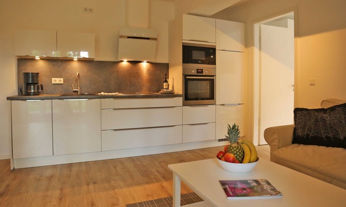 Our apartment with south-facing terrace (9sqm) is located on the ground floor in a completed in 2015, architecturally appealing quiet residential complex in the idyllic Baltic Sea Nienhagen. You can expect a modern furnished 2-room apartment with space for up to 3 people plus a toddler up to 3 years (in Kinderreisebatt).