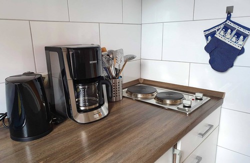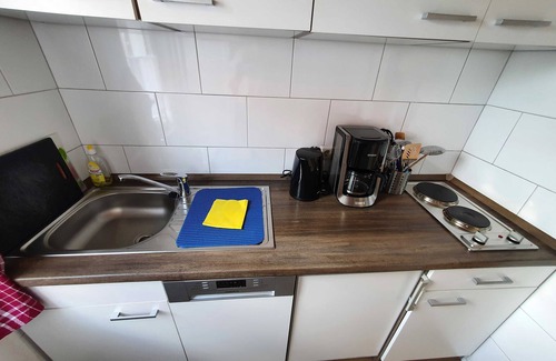 We offer a cozy, bright living and dining room with flat screen TV and radio. It is also equipped with a couch and a dining area. Our bedroom has a comfortable double bed 180x200 cm and a practical wardrobe. Our second bedroom is furnished with a new comfortable upholstered couch (90x200 cm). The kitchen is equipped with dishwasher, refrigerator and two hotplates! Furthermore, there is also a microwave !., coffee maker and a toaster available The shower area in the bathroom is spacious and can accommodate 2 people. Bed linen is available, please bring towels. Outside: On warm days you can have breakfast on our furnished terrace or enjoy the sunset in the evening after a barbecue. The free parking is located directly at the house.