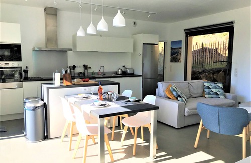 • Open-plan kitchen fully equipped with oven, microwave, ceramic hob, extractor hood, dishwasher, fridge/freezer, Nespresso machine, toaster, kettle, etc.