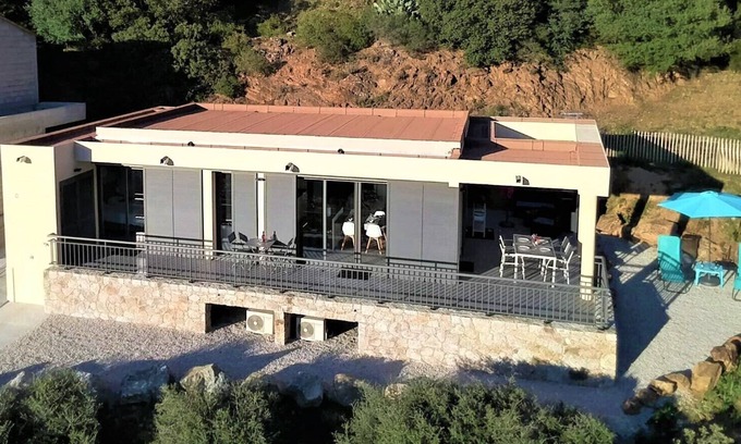 New contemporary house with large windows and high-quality finishes, located in the charming village of Belgodère, close to the beaches (Lozari 9 min), L'Île-Rousse (15 min), and Calvi (30 min).