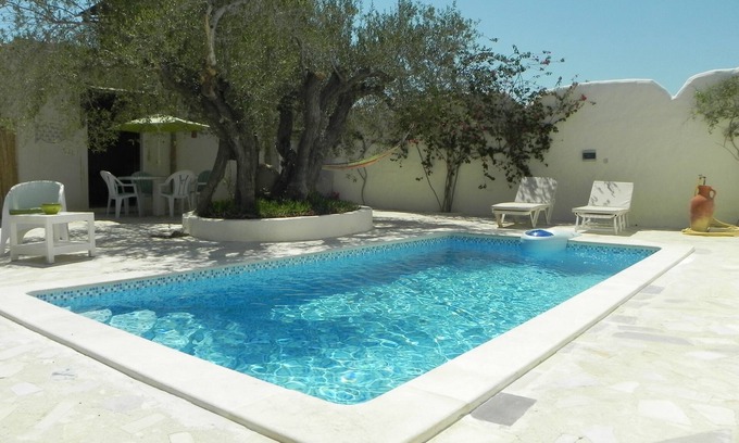 (Text automatically translated) small very nice and comfortable house in the countryside, in the heart of the island of Djerba. quiet and peaceful. pool, deckchairs, barbecue .... petanque "The sheets and towels are provided" housekeeper (cleaning and cooking) 70 euros per week including final cleaning Noura will discover its small Tunisian dishes.
