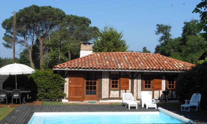 (Text automatically translated) This small Landes house, full of charm and gaiety consitutes with three other houses dating from the same period a farm Landes typique.Idéale for a couple and two children, it is located in the heart of the forest on a 5-hectare property at the pool (6.5mX3.5m) for the exclusive tenants of the house use, quiet and relaxation are guaranteed after a day at the beach.