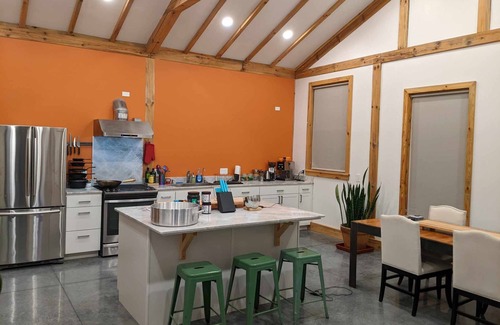 Kitchen with a View: Step into our beautiful timber frame kitchen, where every meal becomes a delightful experience. Overlooking an expansive backyard adorned with fruit trees and majestic pines, you'll feel a sense of serenity as you prepare your favorite dishes.