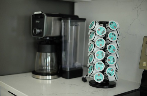 ☀ Stocked with complimentary coffee, tea, snacks, sparkling and bottled water, soda, beer and wine