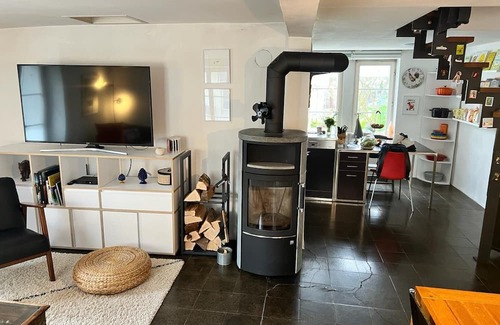 House with garden on the Aare. Open-plan living room incl. kitchen and bathroom. Upstairs are the two bedrooms with double beds. The office is in the annex. The garden/meadow is open to the neighbours. They also help us with the Airbnb management. In summer the Aare invites you to swim. Close to the city and a recreational zone. Friendly young families to the left and right.