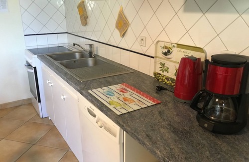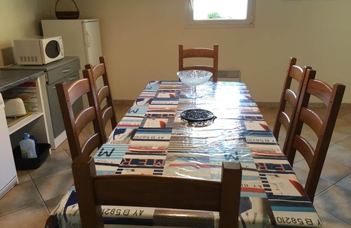 Living area with table and 4 (or 6) chairs. Lounge area with coffee table, stools, sofa bed, sideboard and television. American kitchen fitted and equipped with top fridge, microwave, small oven, 2 hotplates, toaster, coffee maker, teapot, vacuum cleaner, highchair, iron and ironing board, dishwasher in the house 6/8 people. A bathroom, shower and basin. An independent wc. Washing machine in common laundry room.