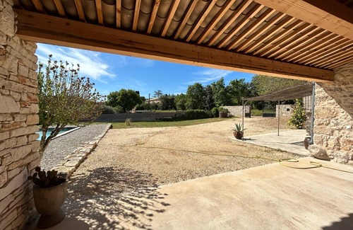 Former Provençal farmhouse renovated with a contemporary flair. This wine cellar is situated on expansive grounds in a quiet hamlet with beautiful unobstructed views. The 40m2 living room opens onto a large terrace shaded by a centuries-old mulberry tree. You can enjoy two terraces and a very spacious shaded patio at your leisure throughout the day.
