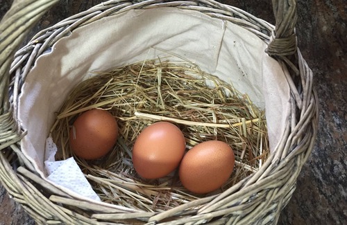 Summer garden with fresh vegetables and daily collection of eggs from our happy chickens, we do not have a rooster.