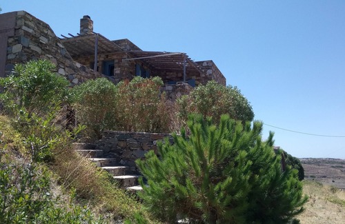 Panoramic view of the Aegean Sea, several islands and the sunset in the sea. Calm, independence, discretion. 2 bedrooms with French windows opening onto a terrace and sea views due west. Terrace. Possible day trips to Tinos, Mykonos-Delos, Serifos, Paros.