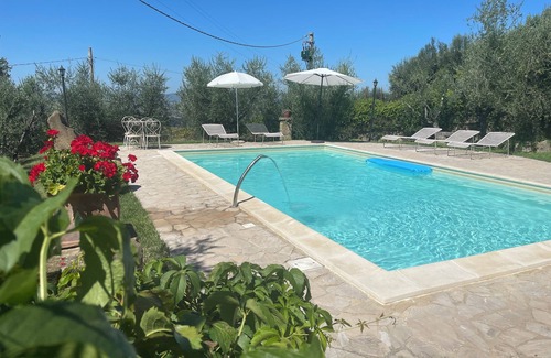 The property lies on the outskirts of the small village of Castelleone, in a hilly location with panoramic views. The location is a perfect starting point for who want to discovery Umbria. The main cultural and religious centers (Orvieto, Todi, Perugia, Assisi, Spello, Spoleto) of Umbria can be reached in about hour by car. It's a house with a fully fenced garden and private pool. The whole property is for private/exclusive use of the tenant. The swimming pool is 9 by 5 meter and depth goes from 1,20m to 1,40 m. The pool area is equipped with parasols and sun loungers. It is suitable for 8+2 persons (3 bedrooms/8 bed places + double sofa bed in the living area). The house has been completely renovated with typical Umbrian materials and the furnishings maintain the local style. In the outdoor area there is a covered panoramic terrace with a dinning table for 10 and a bbq.