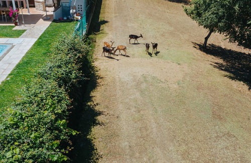 View to the natural park of animals (deer, peacocks, etc.).