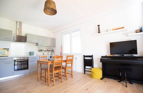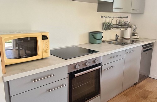 This 2-bedroom, 1-bathroom rental features a BBQ grill and a desk. Bathroom amenities include a hair dryer, towels, and toilet paper. The kitchen is equipped with an oven, a stovetop, and a refrigerator, as well as a coffee maker, an electric kettle, and a microwave. And because there's access to laundry facilities, you can go a bit lighter on your packing.