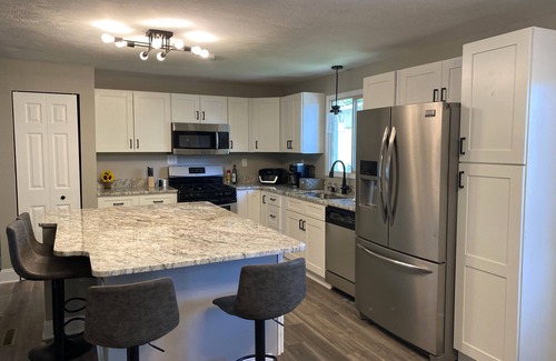 The house has just undergone a complete renovation and remodel, with all new flooring, cabinets, counters, and appliances! The first-floor great room includes kitchen, dining area and family room. It combines a large and airy kitchen, a family room with a 65 inch TV and plenty of seating (8+ people), and a dining area that seats 6. The kitchen includes granite countertops and all new stainless appliances. It includes a large island with additional seating for 4 people and even a drink fridge!