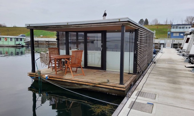 The houseboat is firmly anchored to the jetty, but there is electricity, water and sewage.
