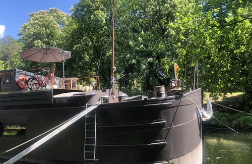 The tranquility of the countryside in the middle of Metz (village-town), along the towpath lined with chestnut. New apartment built in part of the hold of a 1950s barge moored on the towpath 300 m from a free parking.