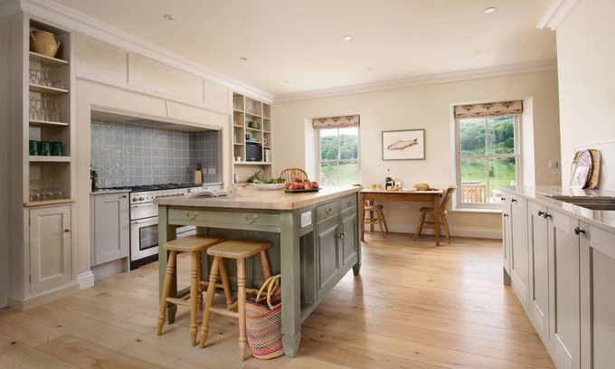 Entering the large country-style kitchen, the hallway flagstones give way to warm timber floors and a soft palette of sage green, cream and grey blue. A rustic wooden island and dining table make this a delightful space in which to cook and relax – those indulging in the former will particularly appreciate the Rangemaster oven with five burner hob and separate pantry with a large Fisher & Paykel refrigerator.