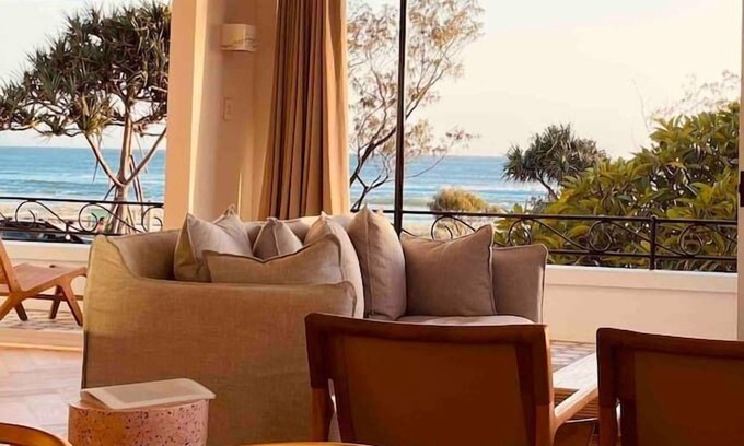 Has a fully equipped kitchen with Meile appliances and generous balconies overlooking Currumbin beach right across the road.