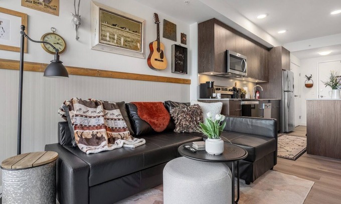 As you enter our brand NEW condo, you'll be transported to the era of cowboys and outlaws with our carefully curated Western decor. The spacious living area features decor, a fully equipped kitchen with modern amenities, and a kitchen island that doubles as a space for meals.