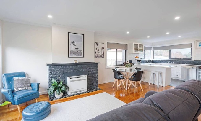Set on a peaceful street, this spacious retreat blends retro charm with beachside comfort, perfect for a laid-back getaway. The main living room is bathed in natural light and fitted with plush recliners and built-in heating, creating a cosy spot to gather after an active day. On the lower level, a second living area offers a more playful mood with soft seating, a rustic bar, bar stools, and two TVs—a perfect nook for evening cocktails or watching the game with friends.