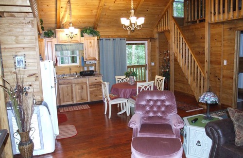 This cabin has two queen beds; one downstairs & one in a large loft. The cabin sleeps up to 5 Adults. It has: • Full Bath • Heat and Air • Full Kitchen • Microwave • Washer/Dryer • Flat screen TV w/ Dish Network • 1 DVD/CD Player • Park Grill and Fire Pit • Covered Back Porch, with breakfast nook • Handicap Access Ramp.