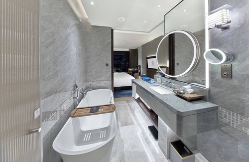 HUALUXE Nanjing Yangtze River by IHG offers 395 air-conditioned accommodations, which are accessible via exterior corridors and feature minibars (stocked with some free items) and safes. Accommodations offer separate dining areas. Beds feature down comforters and premium bedding. A pillow menu is available. LCD televisions come with satellite channels. Bathrooms include separate bathtubs and showers with rainfall showerheads and hydromassage showerheads, bathrobes, slippers, and complimentary toiletries.