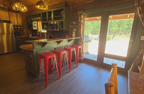 Rustic meets Modern in this comfy open floor plan cabin, it's the perfect place to stretch out & relax after a day of traveling or adventuring. The Cabin features a new Mini Split Heating and Cooling system, stainless steel appliances & a fully stocked kitchen, as well a BBQ Grill. It has a dedicated WIFI connection, a large SMART TV, an assortment of games & plenty of area related reading material. You'll also find cornhole and horseshoe pits for a little entertainment in the backyard. The cabin has a fun dining area with breakfast bar & your own in-house laundry.