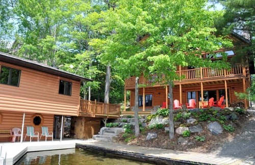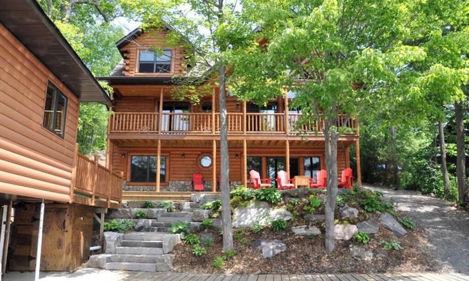 Welcome to this spectacular 4,200 sq. ft 3 level, 5 bedroom authentic log cottage and spacious one bedroom boathouse bunkie on the peaceful shores of Gloucester Pool. It is the perfect vacation destination for a large family or 2 small families! One of the main drawing cards for purchasing the property, besides loving all that it has to offer, was that this area is the first of the Great Canadian Shield and is only 1.5 hours from Toronto. As you step in from the driveway foyer, you are greeted with stunning tree-top views of the lake from a wall of floor to cathedral ceiling windows. The open concept kitchen/dining/living area is warm and inviting with pine ceilings, log walls, cork flooring, a gorgeous floor to ceiling wood burning stone fireplace and tastefully appointed furnishings and cottage décor accents. The 80 feet of waterfront is ideal for both young and old alike, with a sandy shallow area, great for the kids to safely splash and play in the lake. With a southwest exposure, you will enjoy sunshine all day, starting from 10am and then in the evening embrace glorious sunsets from any of the decks.