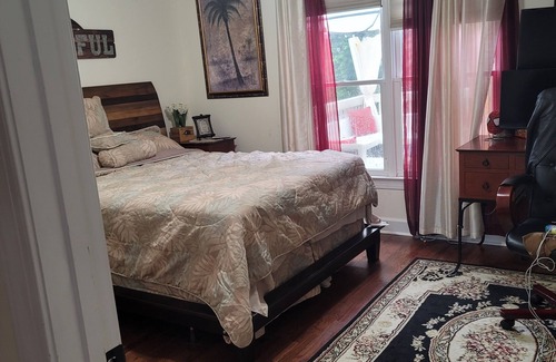 It is peaceful, safe quite Neighborhood where you can come and relax. Beautiful deck with view of nature, big garden walk and hear birds sounds. Apple bigscreen TV and full kitchen .enjoy the formal or casual dinning area.
