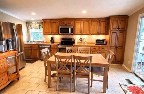 Fun, fun, fun on the lake. Large boat house with room for boats. Boat House has a Charcoal Grill, dining seating for 6, and fishing rod holders for you to catch dinner. Large screened porch with spectacular views of the Lake and room for dining or relaxing. Eat-in Kitchen with Stainless Steel appliances and a table for 6. King sized beds in all 3 bedrooms each with their own TV.