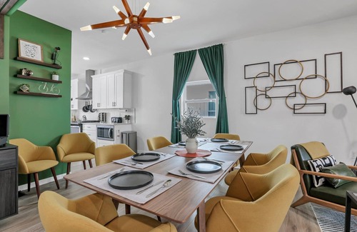 This charming house features four elegantly designed bedrooms that sleep up to eight guests, ensuring everyone has a comfortable and stylish place to stay. The full kitchen is equipped with high-end stainless steel appliances and a dining area that accommodates all your wedding party members. Enjoy quality time in the bright and airy living area, complete with a 65-inch Roku TV and Bluetooth soundbar for entertainment. The lovely backyard is perfect for relaxation and casual gatherings, featuring a fire pit, outdoor games, and a cozy hammock for post-wedding unwinding. You can even bring along your furry friend, as the property is dog-friendly!