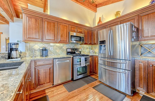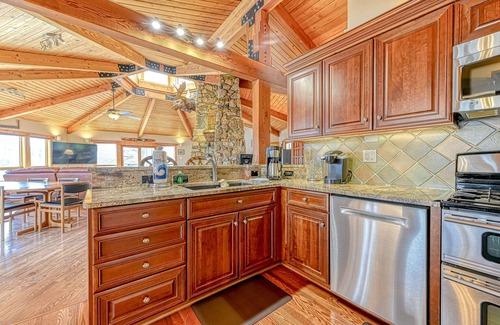 Everyone will love the huge main living space, highlighted by the soaring, pentagon-shaped wooden ceiling and enormous stone fireplace. There are lots of cozy spots to gather, as well as a wall-mounted flatscreen positioned just right in front of two buttery leather couches, perfect for unwinding at the end of the day. Elsewhere on the main floor, you’ll find an updated, modern kitchen, with a full suite of stainless steel appliances, including a double oven, and all the gadgets the chef will need to whip up a feast. When it’s time to eat, the group can convene at two separate tables, one seating six and one seating four. Just off the dining room/library, you’ll find a screened-in porch with lots of seating and a lake view, perfect for morning coffee or a sundowner.