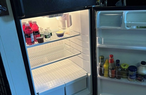 Kitchenette (hot plate, toaster oven, fridge, microwave) table & chairs