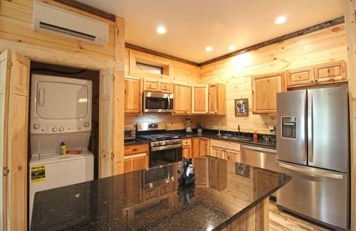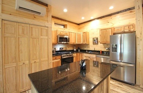 This exquisite retreat features modern amenities designed to ensure a comfortable stay. Enjoy the serene views of the community pond from your covered patio or unwind in the indoor whirlpool tub after a day of festivities. The cabin is complete with hardwood floors, hickory cabinets, and tasteful decor, creating a cozy yet elegant environment. Each unit is equipped with high-speed wireless internet, flat-screen TVs with Direct TV service, gas log fireplaces, and fully stocked kitchens featuring granite countertops. Whether you are hosting your wedding ceremony on-site or planning a bridal party getaway, Huggie Bear provides everything you need for a memorable experience.