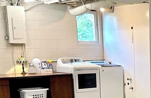 There is a washer and dryer located in the basement. When you enter the kitchen through the carport door (the one with the keypad), you'll see a door on your right that leads to the downstairs area. The ping pong table is in the basement. Check out instructions do include placing your white sheets and white towels in the wash and starting.