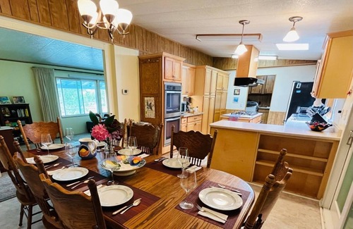 Inside, the kitchen is top chef with a double oven, 5 burner island range, microwave, dishwasher, instapot, toaster, blender, food processor, french press, single cup pour over, coffee grinder, electric water kettle, teapot, and more. There are lots of quality pots, pans, and cooking utensils. If you love to cook on vacation then you will be stoked on this setup. There is dinnerware for 8 both formal and plastic.