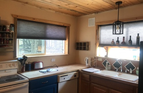 This is a peaceful little getaway with a lot of options. The home is nestled in the trees right on the Willow Creek Greenbelt, with a trail, ancient trees, and babbling Willow creek. The greenbelt is accessed from the back of the lot. Amidst the beautiful juniper, piñon, and ponderosa pines on the lot are beautiful mountain views from the back yard and the house. It a perfect place to reconnect with nature. There is a very comfortable large living room with stairs to the bedroom that has a peaceful patio for your morning tea or coffee. The living room goes into the kitchen/dining room area and also the bathroom. The property is surrounded by beautiful trees and mountain views from the bedroom. The bedroom is on the second floor and there is a steep staircase (with a sturdy hand rail) to get to it.