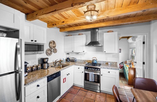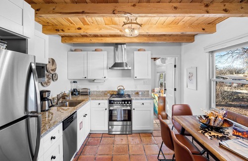 This charming renovation offers visitors a taste of mid-century Santa Fe. With customizable heating and air system, fully-stocked kitchen with stainless appliances and granite countertops, two bathrooms (one full bath, one 3/4 bath with walk-in shower) and outdoor living space with two seating areas, fire pit and landscaping, you can have it all. With the exception of some vintage, artisanal pieces, furnishings are new as are all linens.