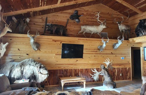Get away from the hustle and bustle of the city. Come stay at this hunter's lodge with exotic animals on display. With a fully functional kitchen including a microwave, you and your companions can enjoy the views of this 700-acre ranch and still bring that home-cooking with you. During the hunting off-season, you can still enjoy fishing in the pond or clay shooting. Feel free to bring the whole family as this property can sleep up to 14 people. This is a secluded location with wildlife including deer. Plenty of space outside to play games, have a picnic or just hang out and enjoy the peaceful ranch. There is a regional airport 25 minutes away along with groceries, restaurants, and shopping.