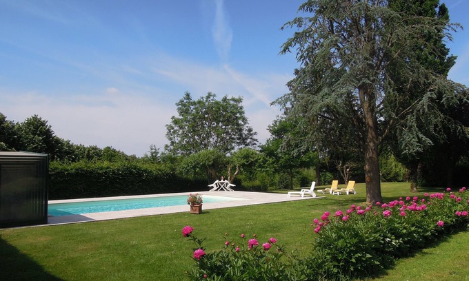 EQUIPMENT The semi-detached lodge (there is also a West Wing), with 3 hectares garden and orchard, and exclusive access to private swimming pool is luxuriously restored, with antique furniture, original engravings, paintings , furnished and equipped with all the modern accessories (WiFi, TV with CD & DVD players and satellite dish with almost all German, and the most important English & American TV stations). Garden furniture, games, table tennis, 8 bicycles (for children (3-18 year) + 4 for adults, and BBQ grills are available. The lodge is surrounded by well kept wooded gardens and a not impenetrable fence. The rentable East Wing, with three bedrooms has a large living room with open fireplace (38 m²) and an open kitchen (4m2) with 4 electric hobs (induction), pressure cooker, microwave and oven, dishwasher and bar. Furthermore, in the kitchen annexe/laundry room, a drying and a washing machine, 2 refrigerators, (one freezer and one, very great, for cooling). Two separate toilets and two bathrooms, each with double washing sinks, shower (downstairs) and bath (upstairs).
