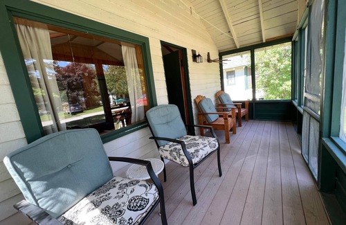 Screened-In Front Porch: The porch extends along the front of the cabin, complete with chairs.