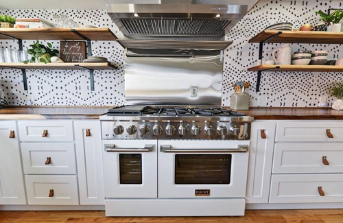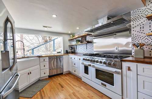 A chef’s kitchen is well stocked with an everything you need to prepare a quick meal or a gourmet feast. Pots, pans, mixing bowls, utensils, dishes, silverware, storage containers, as well as Kitchen Aid stand mixer, coffee maker, coffee grinder, electric kettle, toaster & microwave. The gas stove has 8 burners, a removable griddle, and two ovens, one full size and one smaller. Salt and pepper, basic spices, sugar and flour are also on hand.