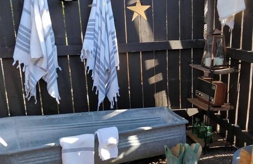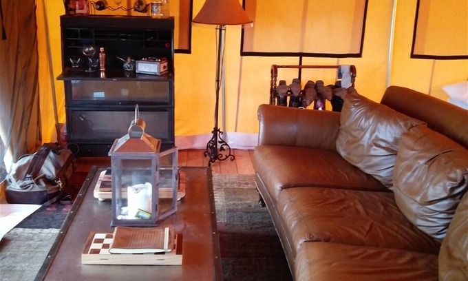 Enjoy great wines, hill country sunsets and evening campfires "off the grid"....then slip into tents on natural cedar decks with premium beds, rich cognac leather, antique furniture and accents. (Bring your own king size sheets)