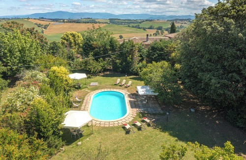 Situated out of sight of the house in a secluded lawn, isolated from the main garden by trees, flower beds and tall hedges, is the oval swimming pool (5 x 10 meters and 1.5 meters maximum depth). It is bordered on one side by fruit trees, and on the other by lavender and rosemary hedges and oleander bushes, which form a protective screen. A row of tall cypress trees forms the boundary of the park which overlooks the spectacular landscape of the unspoilt Val di Chiana countryside, with Pienza in the distance and, perched on its hill, Montepulciano. The sunny part is fully equipped with two gazebo, sunbeds and umbrellas.