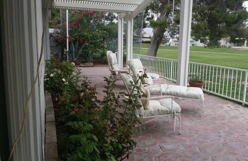 BIG KIDS PLAYGROUND! Golf, Swim, Friends, Tennis, Sun, relax....Bright, CLEAN remodeled, professionally decorated home RIGHT ON the THIRD hole of the GOLF COURSE in a 55 plus community (You must be 55 years old to stay. Photo id will be check when booking)!! 30-day minimum stay. Granite, Stainless steel counter tops, Gardener, Electric Gate, Locking Mailbox, Washer / Dryer, BBQ, 2 Pools, Hot tub, Tennis Courts, Restaurant, Bar, New air conditioner, new furnace. Home comes fully stocked ready to enjoy! The whole home has been remodeled! Your cozy retreat in Thousand Palms with 2 lovely bedrooms featuring a king and queen bed. This phenomenal mobile home offers AC, Wi-Fi, heating, a washing machine, and more. With 2 bathrooms equipped with hair dryers and showers, guests will feel right at home. We hope you enjoy what our place and Thousand Palms has to offer.