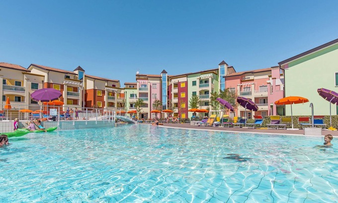 Child friendly, beautiful resort "I Larici", 5 storeys. 93 apartments in the residence. In the district of Caorle-Lido Altanea 5 km from the centre of Caorle, 60 km from the centre of Venezia, 115 km from the centre of Trieste, 400 m from the sea, 400 m from the beach. For shared use: swimming pool kidney-shaped (990 m2, seasonal availability: 15.May. - 15.Sep.). Children's pool, tennis (1 x hard court), floodlit (extra), table tennis, basketball, volleyball, badminton (extra), barbecue. In the complex: WiFi, lift, washing machine (for shared use, extra). Parking on the premises, public parking on the road. Supermarket 300 m, restaurant 150 m, bus stop 550 m, railway station "San Donà di Piave" 28 km. Golf course (18 hole) 800 m. Please note: entertainment in the season. Suitable for families.