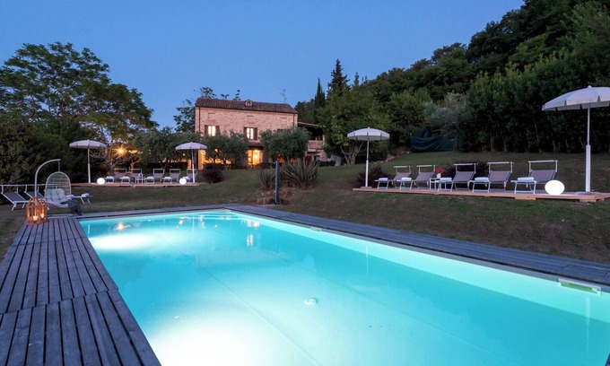 I Lauri is a restored farmhouse dating back to the early 1900s, immersed in the wooded terrain of a private golf club near Montefiore dell'Aso. The property combines original elements such as stone walls, ceilings with exposed wooden beams and wrought-iron stairs with modern comfort, spread over three floors and offering six bedrooms in a large and bright environment. Furnished in a contemporary style, it is perfect for convivial moments, thanks to the professional kitchen and the large spaces dedicated to lunch and relaxation. Outside, the garden is characterized by lawns, shaded areas furnished for relaxation and a pool with panoramic views of the surrounding landscape. Guests can also access the nearby I Lauri Golf Club, with fairways surrounded by trees and views of the sea. This villa is ideal for those looking for a quiet and panoramic base, a short distance from the beaches of southern Marche and the hilly villages of Val d'Aso.