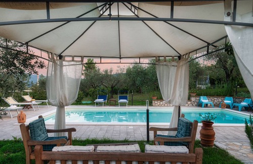 The swimming pool is located at a slightly lower level than the villa, which is about 15 m away, and is reached along a paved path. The rectangular pool, measuring 9 x 4 m with a constant depth of 1.40 m, is lined in PVC and has salt purification, internal lighting and Roman steps for access to the water. The solarium area surrounding the pool is paved in travertine and stone and is equipped with sunbeds, armchairs and a gazebo, which is furnished with a sofa and armchairs to ensure shade during the hottest hours. There is a hot-water solar shower. The pool is open from the last Saturday in April until the first Saturday in October.