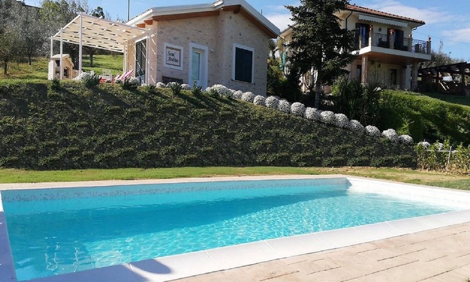 I Tre Laghi, Sant'Andrea - Sleeps 8 in winter and 10 in summer. It is a new built characteristic cottage, completed May 2018 which offers plenty of charm with high wooden ceilings throughout the house. Swimming pool 8 x 4 meters with large gazebo 6 x 4, all enclosed. A private pathway leads to the house with entrance into luminous living area, sofa opens into a double bed with mattress. Access onto large portico with garden table and eight chairs, barbeque area and flower box with herbs. Also equipped with outside wash basin and washing machine. Shade awning. Separate fully functional cosy kitchen with table and four chairs, electric cooker with four burners, oven, microwave, fridge/freezer, dishwasher and all electric appliances. Kitchen with white wooden ceiling gives this room lots of light as each wooden beam is illuminated with led lights. Meals can be enjoyed, appreciating the views of the lake across the road. From living area a retractible fixed wooden staircase for access to a large loft area with double bed and single bed. Passageway. There are two bedrooms, one of which is the main bedroom (two single beds or double bed) which has an en suite bathroom with large shower panel (led lights). Main bedroom also has a loft area with single bed (2 meters x 90 cm). Access from bedroom onto large portico.. Second bedroom with two single beds for use as double bed as well. Second bathroom with bathtub with shower. The home sleeps 4 persons comfortably (bedrooms) 2 persons (sofa bed), 1 person (loft in main bedrom) 3 persons (loft in living area) for a total of 10 persons during summer months. Air conditioning (hot/cold) in living and bedroom areas. Heating/airconditioning paid upon consumption. Cot is also available upon request. Euro 120 is required as cautionary deposit to be paid on the day of arrival and shall be reimbursed on day of departure if no damage. I Tre Laghi is situated at approximately 1,3 kms from the historical centre of Città Sant'Angelo, in a tranquil area opposite three small lakes and consists of a large main house subdivided in two self dependant apartments, Sant'Agnese on the ground floor and Sant'Angelo on the first floor and the separate cottage, Sant'Andrea. Parking facilities within premises. The property is surrounded by 3000 sqm of land which includes olive trees and various fruit trees, enclosed with remote control gates. Accommodation includes kitchenware, bed linen and towels. Wifi. Magnificent views of the countryside, the lakes and Majella mountain. Possibility to also rent the main house together with the cottage for a total of 24 persons. I Tre Laghi is 9 km away from Pescara North – Città Sant’Angelo’s toll booth along the A14 Bari -. Bologna motorway. The town itself offers all amenities, shops, bars, restaurants, chemist, banks, post office, theatre, weekly markets. Ten minutes to Montesilvano and fifteen to Silvi Marina beaches, approximately an hour ‘s drive to the four Abruzzo Parks (Gran Sasso and Monti della Laga National Park, Majella National Park, Molise National Park and Sirente Velino Regional Park. One hour drive to skiing resorts such as Roccaraso, Passo Lanciano, Campo Felice or La Magnola. This area is also ideal for cycling and fishing. Horse riding facilities in the vicinity. For the period 30 December - 3 January a cautionary deposit of Euro 200 to be paid in cash upon arrival which shall be reimbursed on the day of departure if no damage. Upon request Piero and Letizia can organize visits of a true traditional Abruzzo. Tastings of oil, wine and beer. A visit to a pasta factory on how the various pastas are produced. An extraordinary outing to a family run cheese laboratory where you personally join in the family in making the cheese concluded with degustation of various cheeses. An outing with the family and their dogs in truffle hunting which is concluded at their restaurant with tasting of various truffle dishes. We apologise for a slight increase in price this year due to increase of taxes on reservations, cleaning fees and commission.