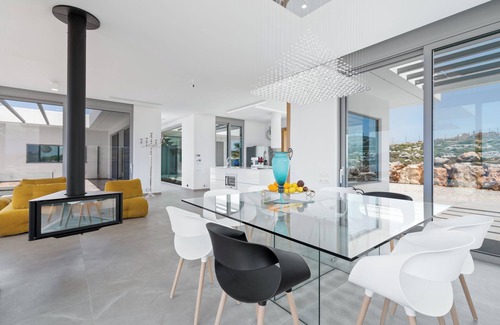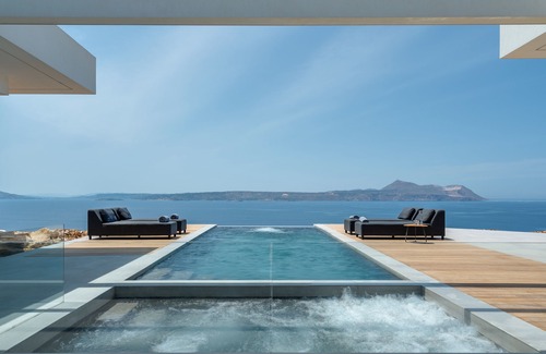 As you step inside, you'll be enchanted by the floor-to-ceiling windows that offer panoramic views of Souda bay, creating a seamless blend between the indoor and outdoor spaces. The villa is furnished with tasteful and elegant decor, creating a warm and inviting atmosphere that makes you feel right at home.